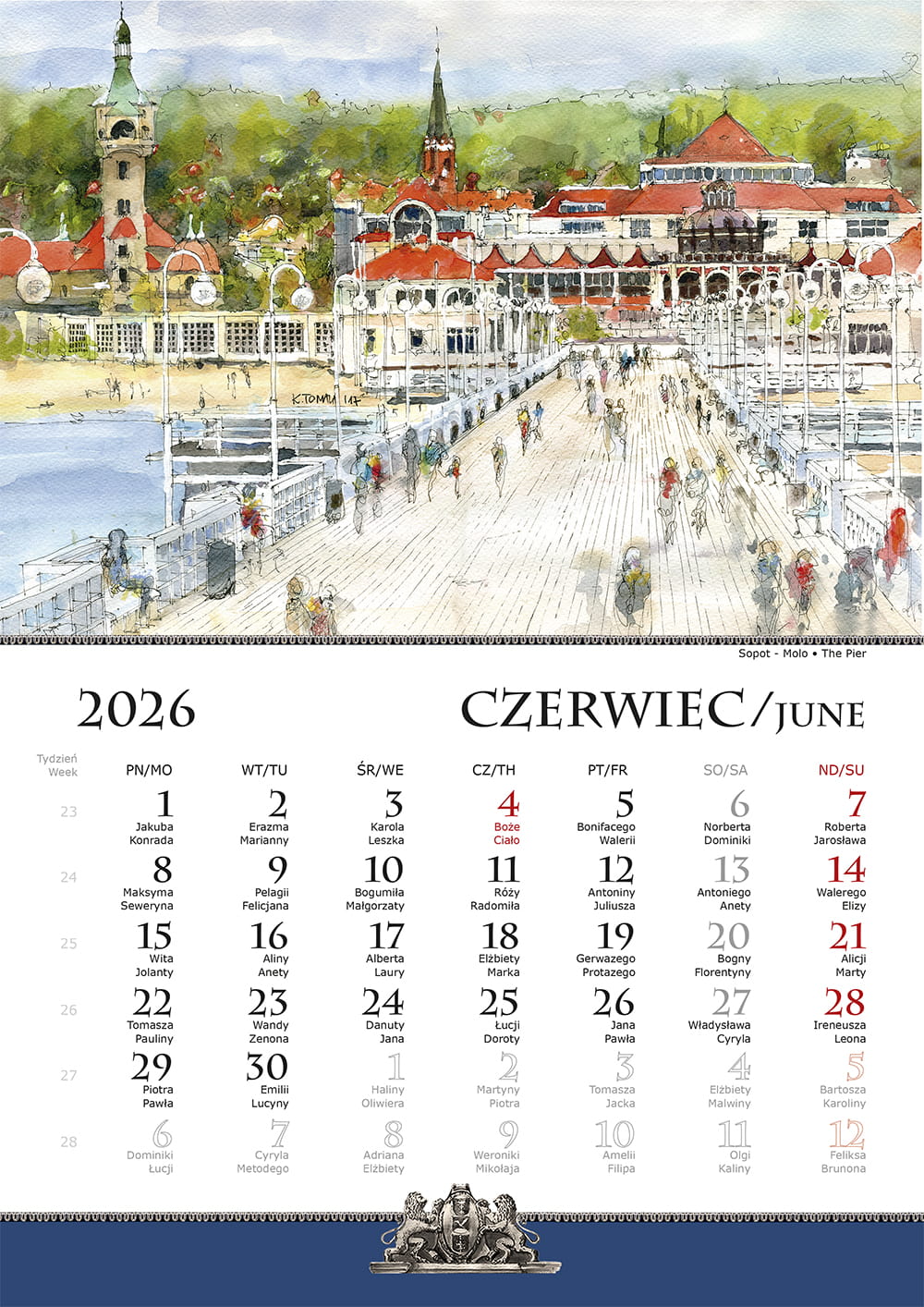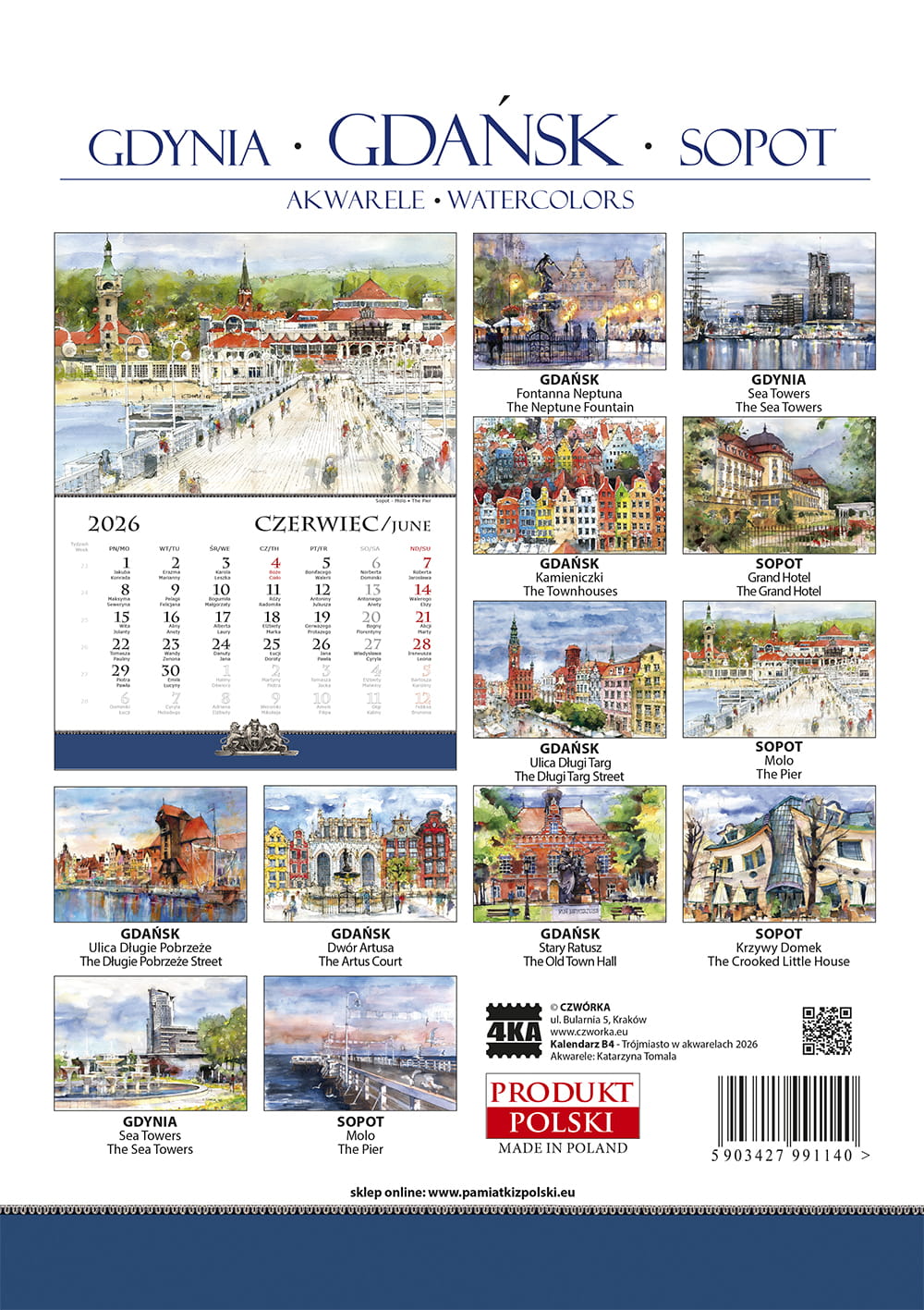 Kalendarz ścienny wieloplanszowy 2026 Gdańsk Gdynia Sopot akwarele Katarzyna Tomala B4