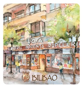 Przedstawia artystyczny obraz najciekawszych architektonicznych i historycznych obiektów Bilbao.