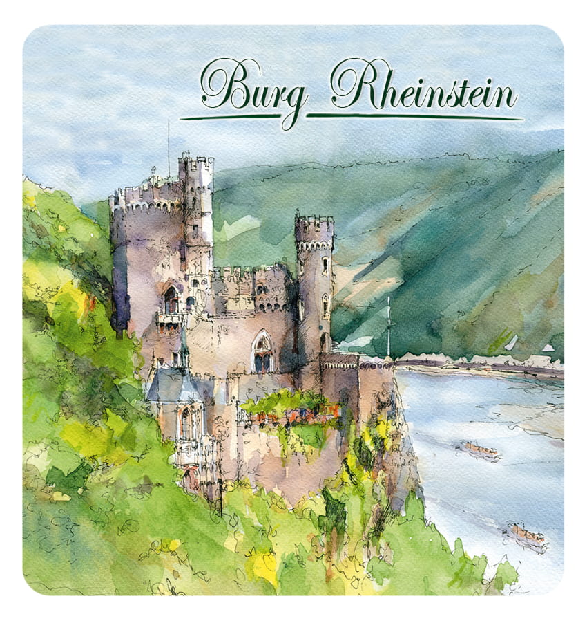 Przedstawia artystyczny obraz najciekawszych architektonicznych i historycznych obiektów Burg Rheinstein.