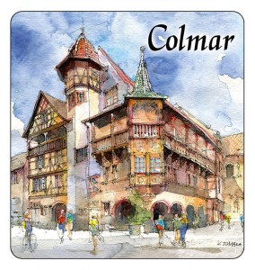 Przedstawia artystyczny obraz francuskiego miasta Colmar.