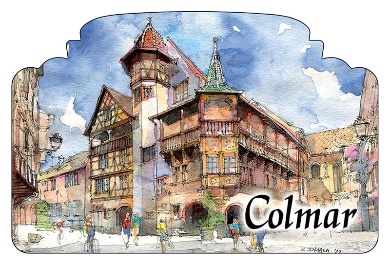 Przedstawia artystyczny obraz najciekawszych obiektów francuskiego miasta Colmar.