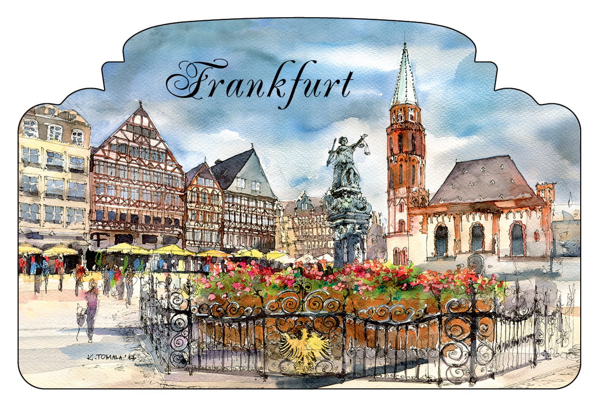 Przedstawia artystyczny obraz najciekawszych architektonicznych i historycznych obiektów Frankfurtu.