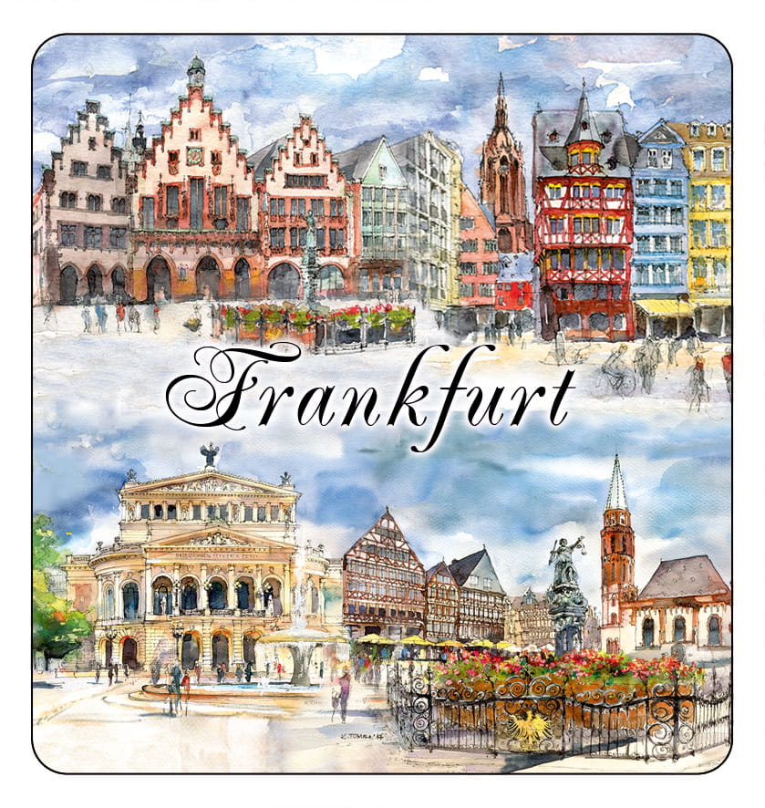 Przedstawia artystyczny obraz najciekawszych architektonicznych i historycznych obiektów Frankfurtu.