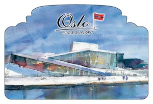 Przedstawia artystyczny obraz najciekawszych architektonicznych i historycznych obiektów norweskiej stolicy Oslo.
