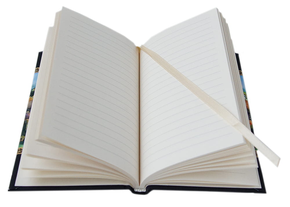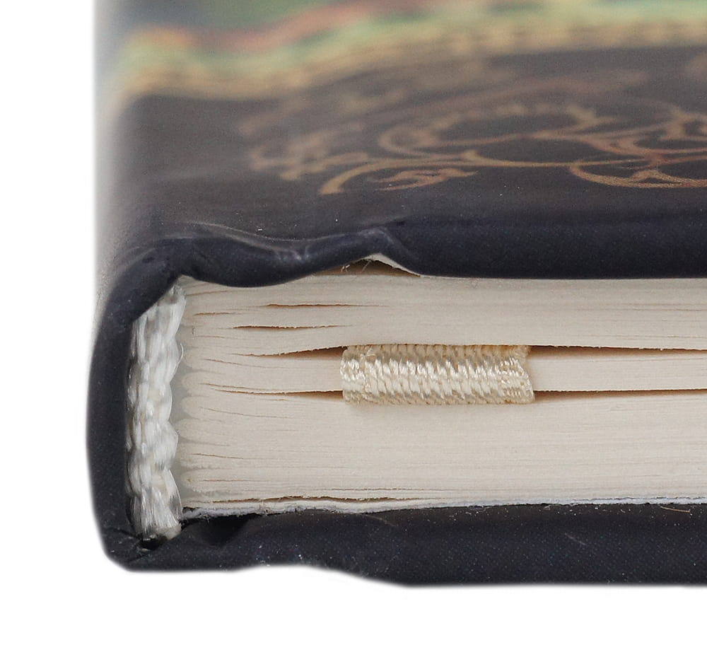 Oprawa szyta i klejona, wstążkowa zakładka . W środku kremowy papier,