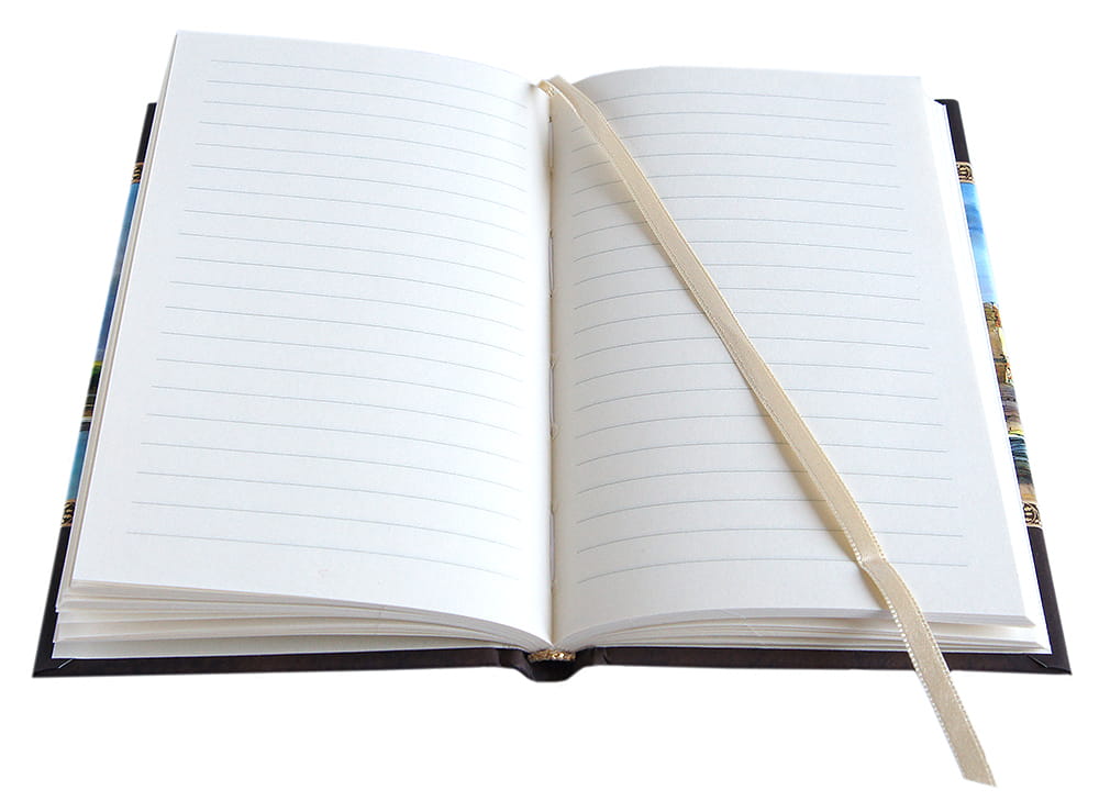 Oprawa szyta i klejona, wstążkowa zakładka . W środku kremowy papier,