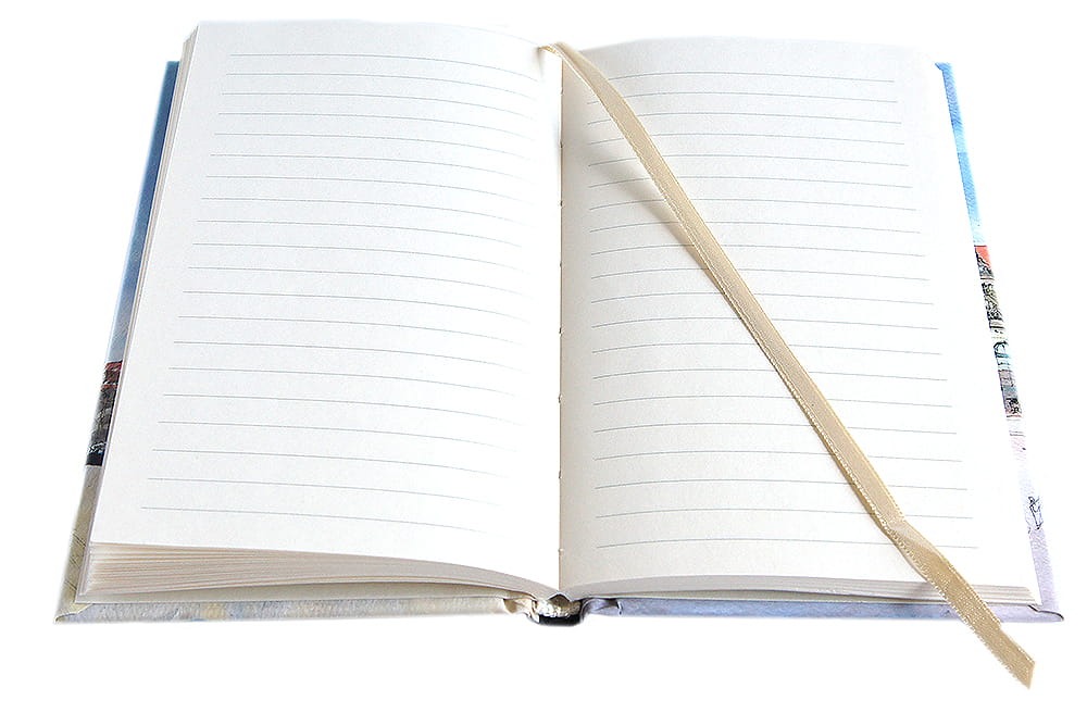 Oprawa szyta i klejona, wstążkowa zakładka . W środku kremowy papier,