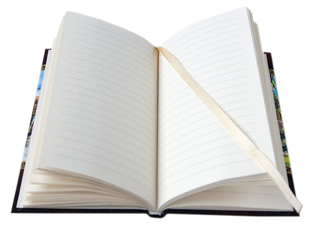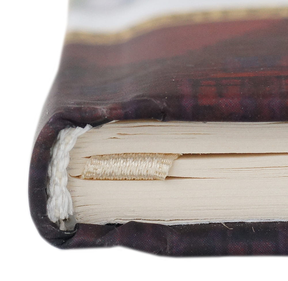 Oprawa szyta i klejona, wstążkowa zakładka . W środku kremowy papier,