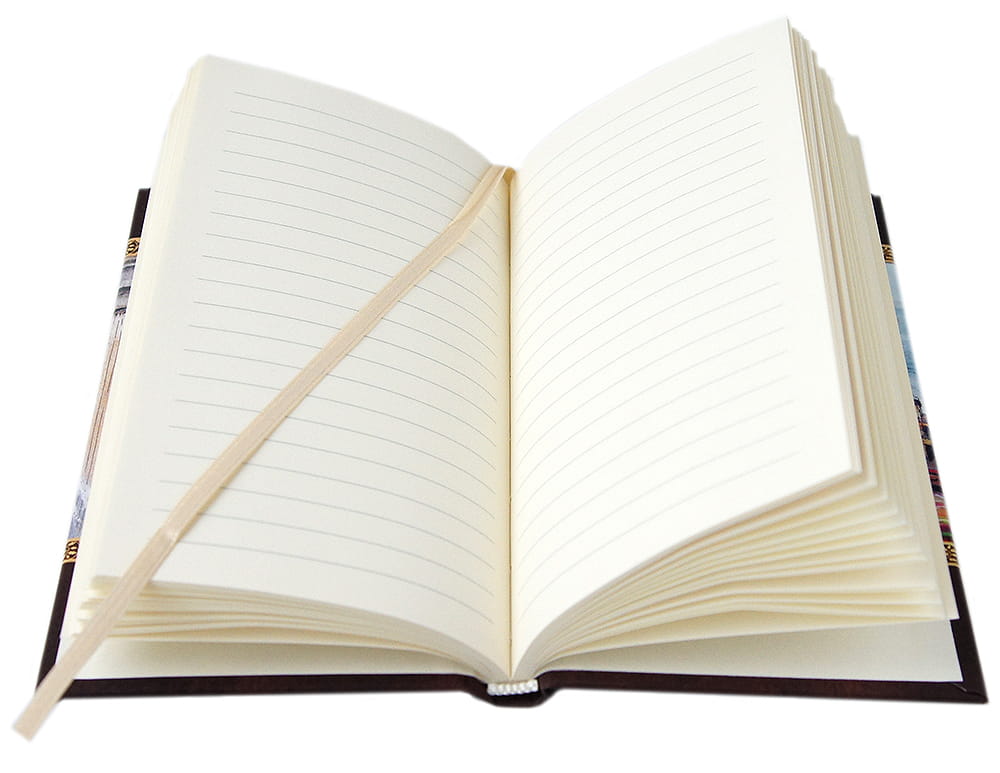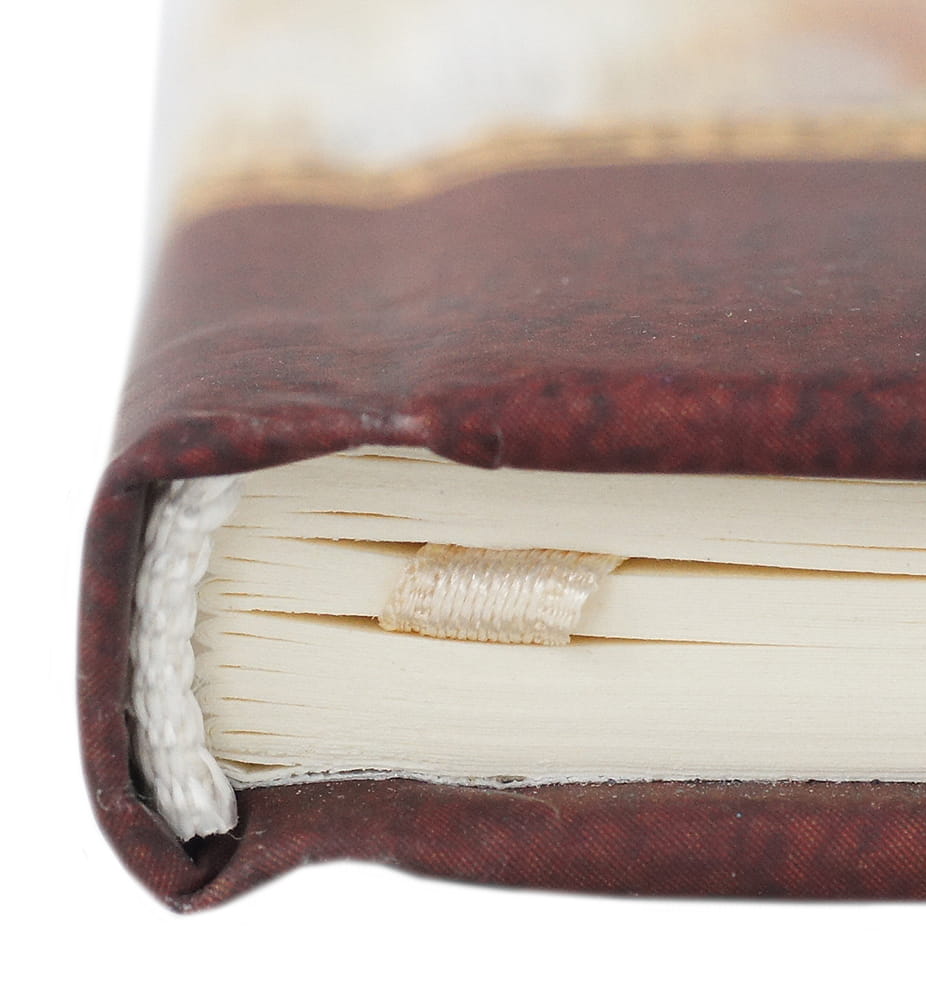 Oprawa szyta i klejona, wstążkowa zakładka . W środku kremowy papier,