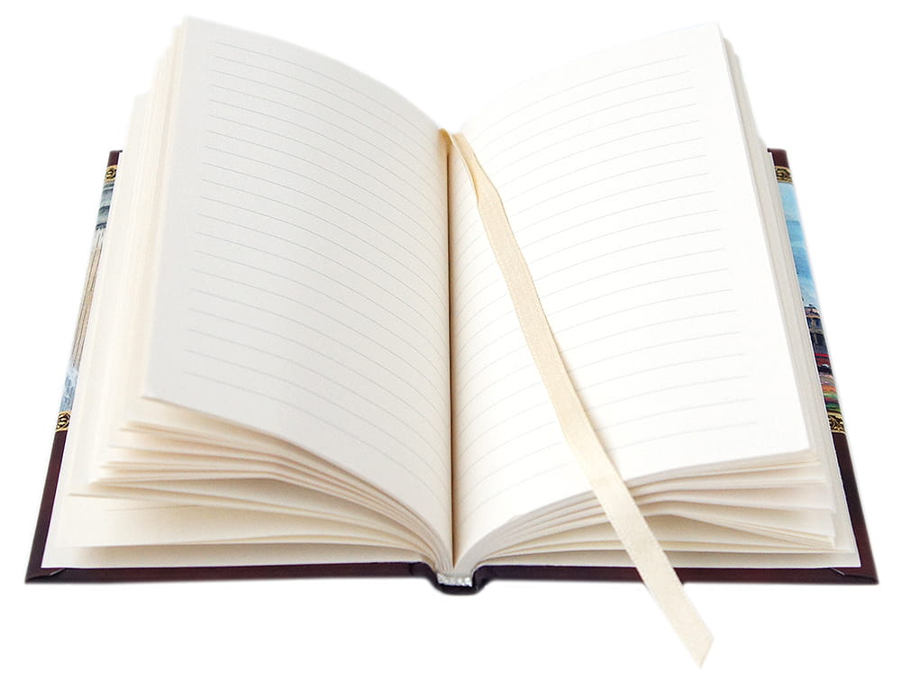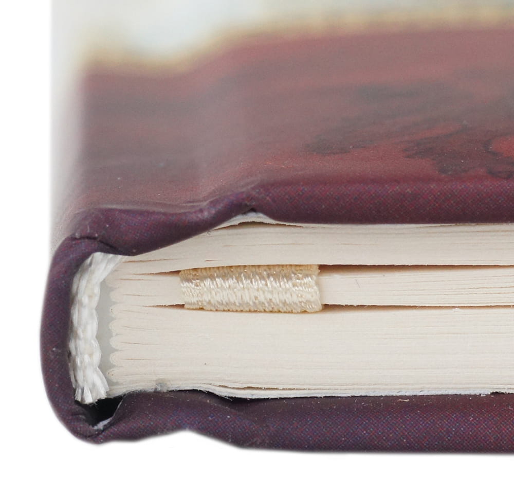Oprawa szyta i klejona, wstążkowa zakładka . W środku kremowy papier,