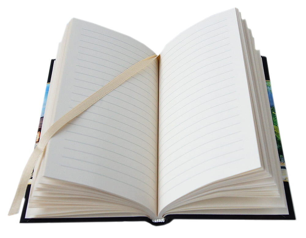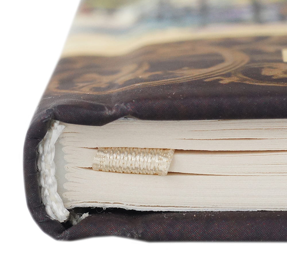Oprawa szyta i klejona, wstążkowa zakładka . W środku kremowy papier,