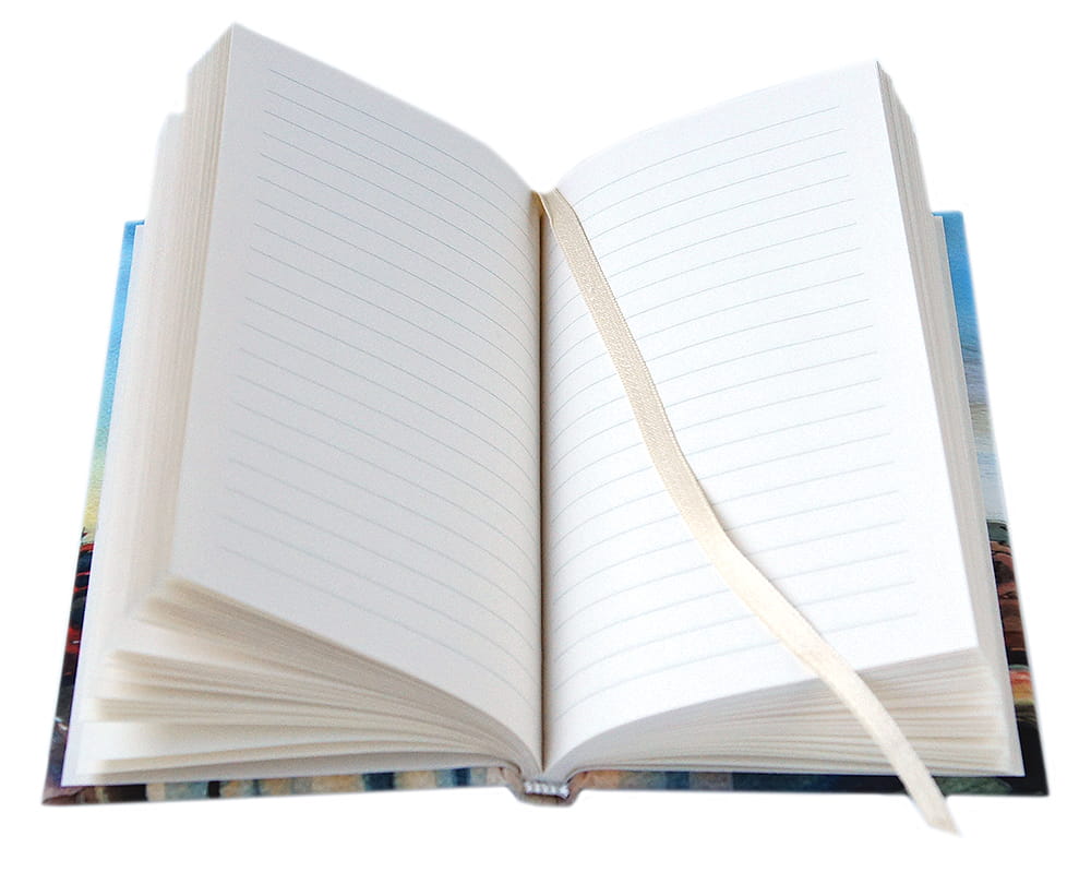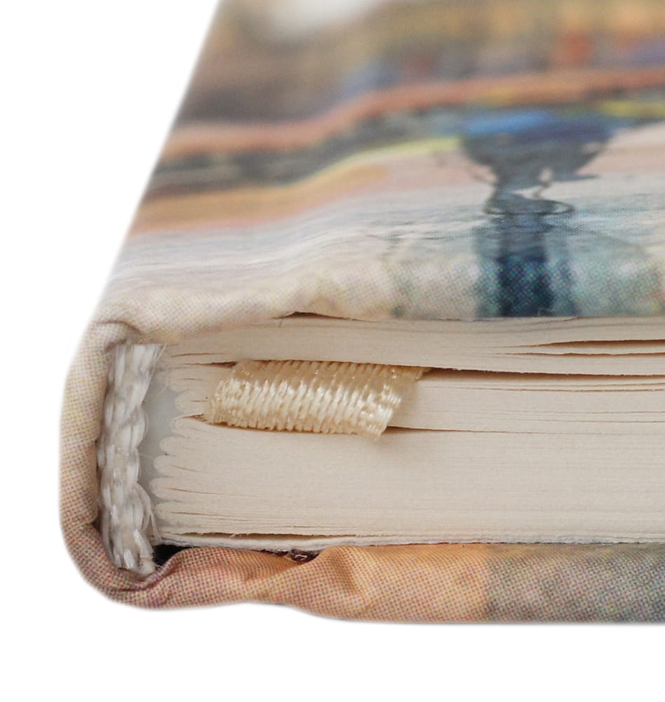 Oprawa szyta i klejona, wstążkowa zakładka . W środku kremowy papier,