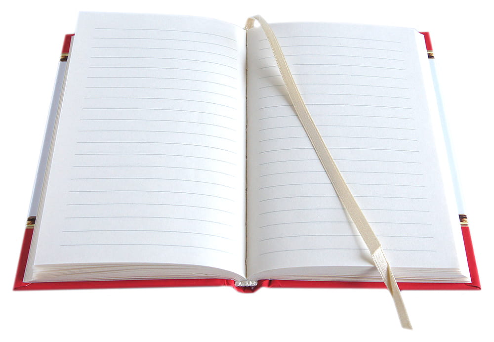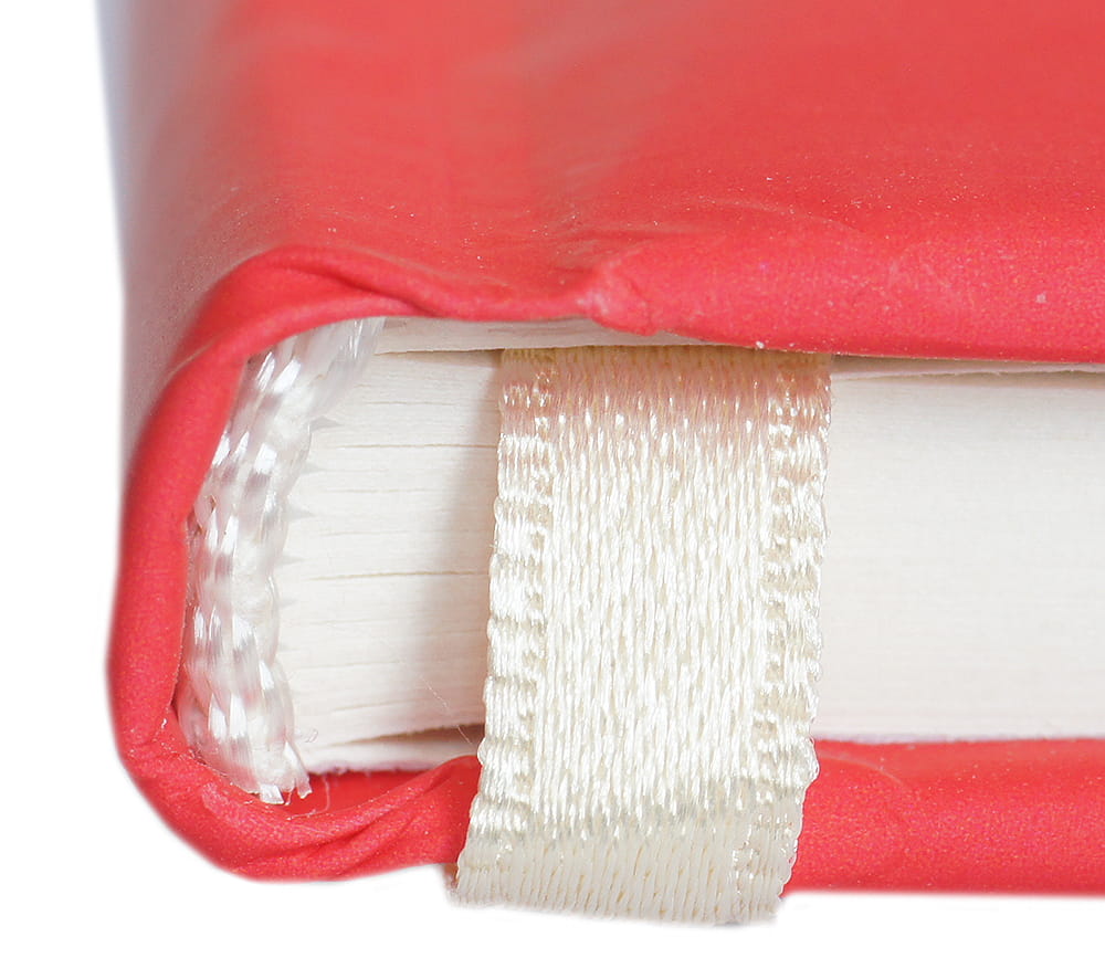 Oprawa szyta i klejona, wstążkowa zakładka . W środku kremowy papier,