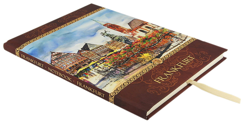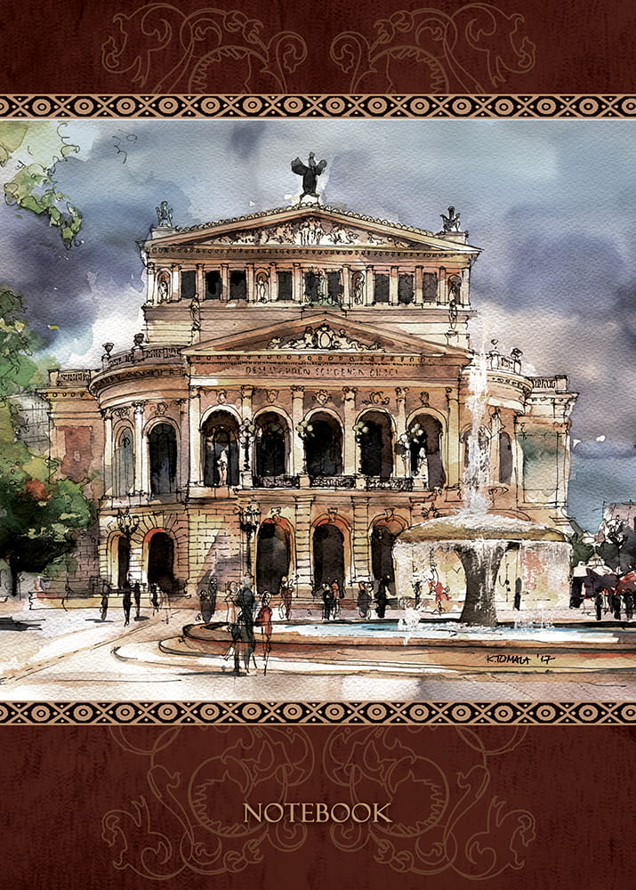 Wzór opracowany przez wydawnictwo "Czwórka", przedstawia charakterystyczne obiekty architektoniczne Frankfurtu nad Renem w akwarelowej wizji Katarzyny Tomali.