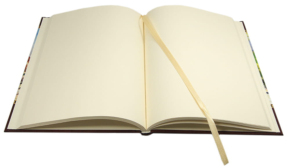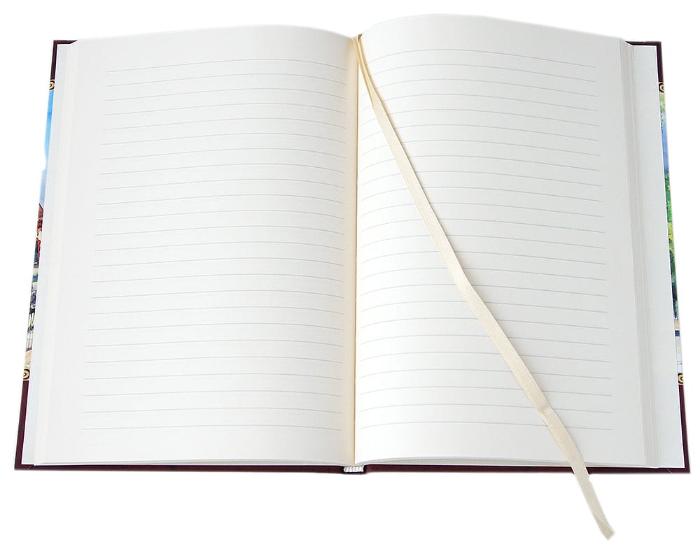 Oprawa szyta i klejona, wstążkowa zakładka. W środku kremowy gładki papier lub drukowany w linie o kolorze szarym.