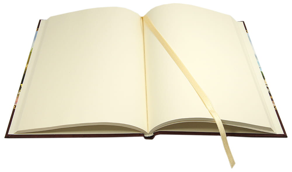 Oprawa szyta i klejona, wstążkowa zakładka. W środku kremowy gładki papier.