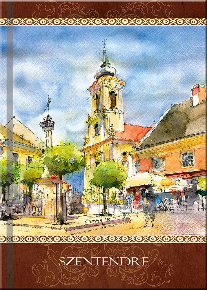 Wzór opracowany przez wydawnictwo "Czwórka", przedstawia charakterystyczne obiekty architektoniczne Szentendre w akwarelowej wizji Katarzyny Tomali.