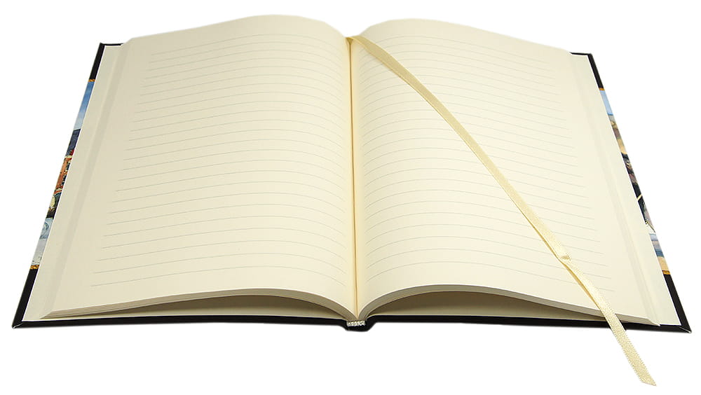 Oprawa szyta i klejona, wstążkowa zakładka . W środku kremowy papier,