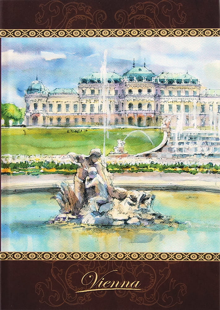 Wzór opracowany przez wydawnictwo "Czwórka", przedstawia charakterystyczne obiekty architektoniczne Wiednia w akwarelowej wizji Katarzyny Tomali.