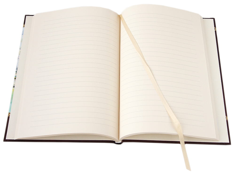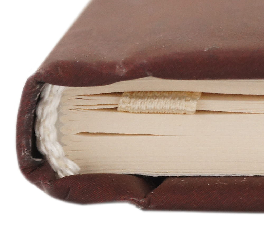 Oprawa szyta i klejona, wstążkowa zakładka . W środku kremowy papier,
