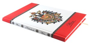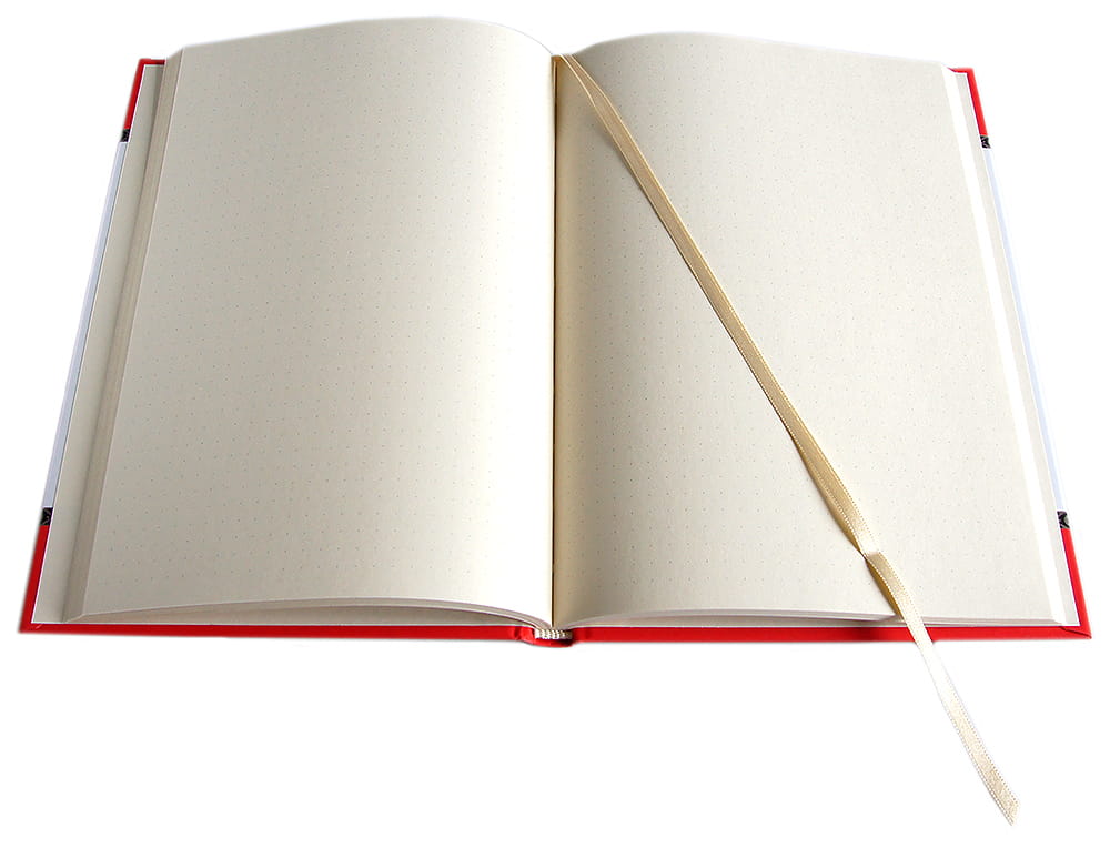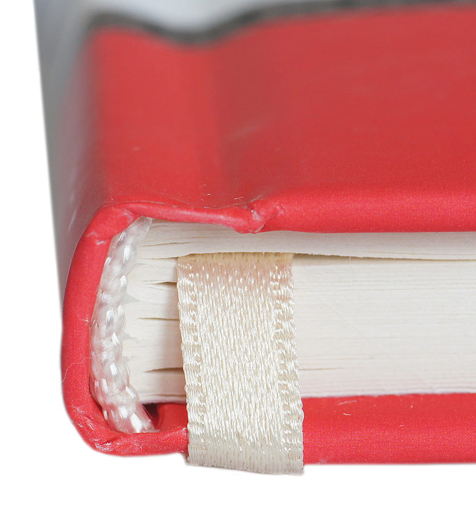 Oprawa szyta i klejona, wstążkowa zakładka . W środku kremowy papier,
