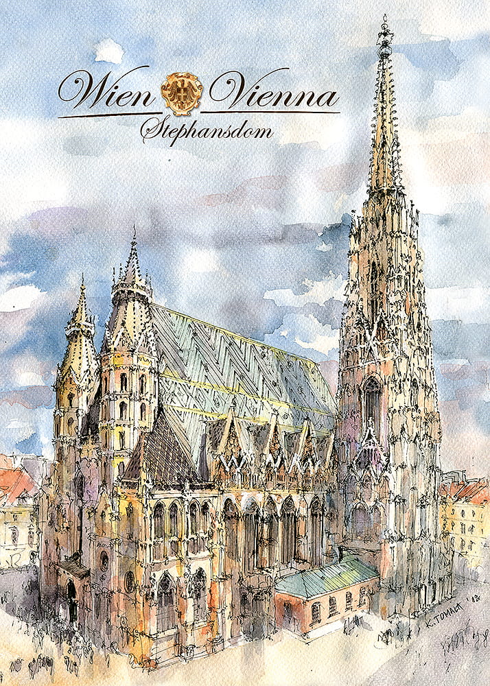 Wzór opracowany przez wydawnictwo "Czwórka", przedstawia charakterystyczne obiekty architektoniczne Wiednia w akwarelowej wizji Katarzyny Tomali.