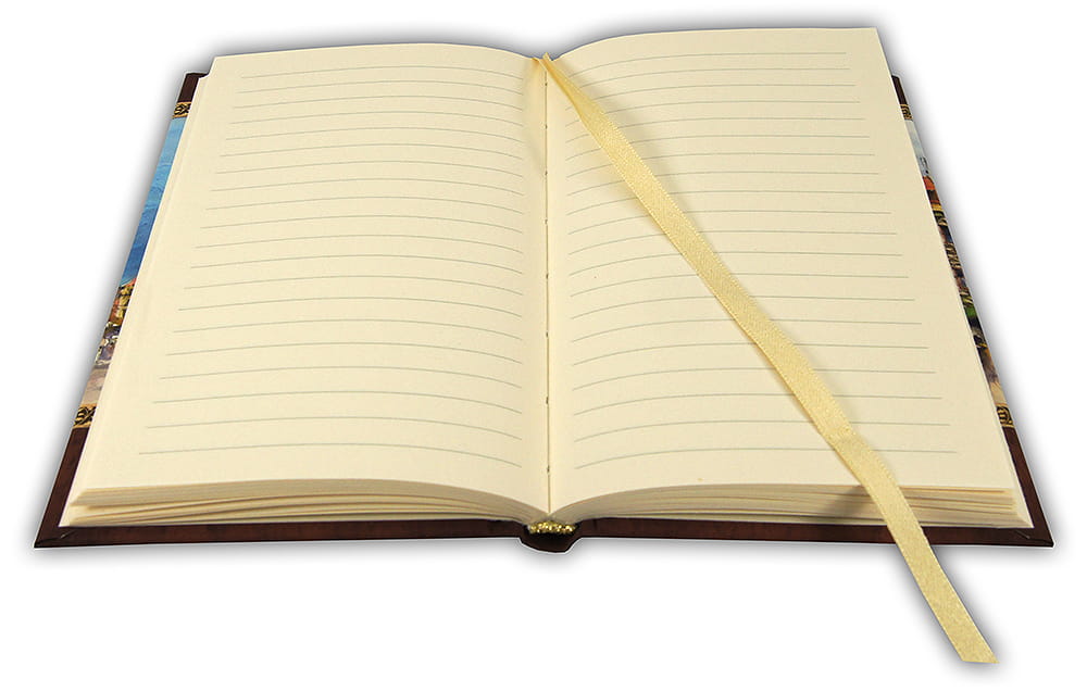 Oprawa szyta i klejona, wstążkowa zakładka . W środku kremowy papier,