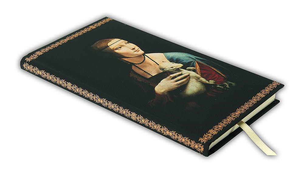 Kartki: kremowy papier, drukowany w linie o kolorze szarym, wstążkowa zakładka.