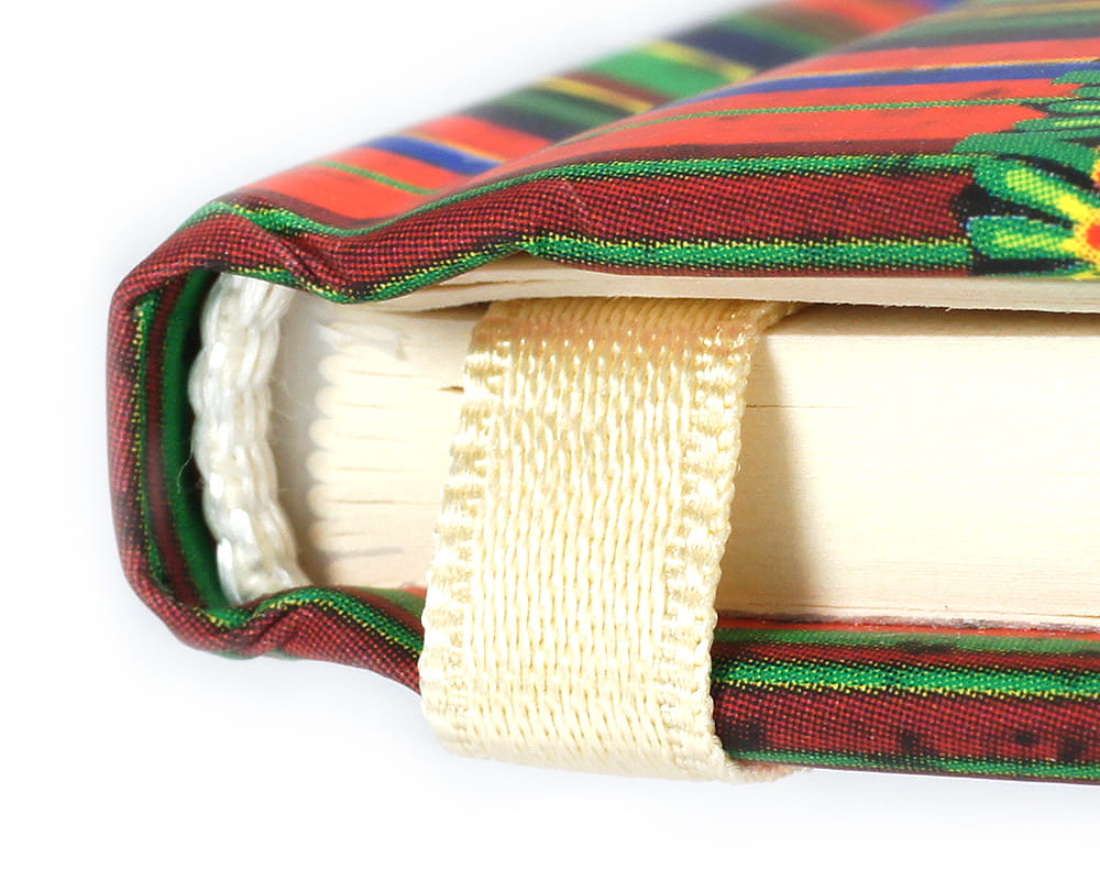 W środku kremowy papier, drukowany w linie o kolorze szarym, wstążkowa zakładka.