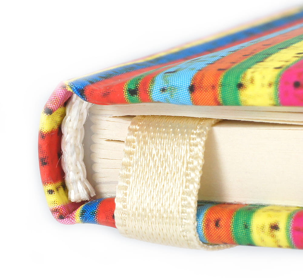 W środku kremowy papier, drukowany w linie o kolorze szarym, wstążkowa zakładka.
