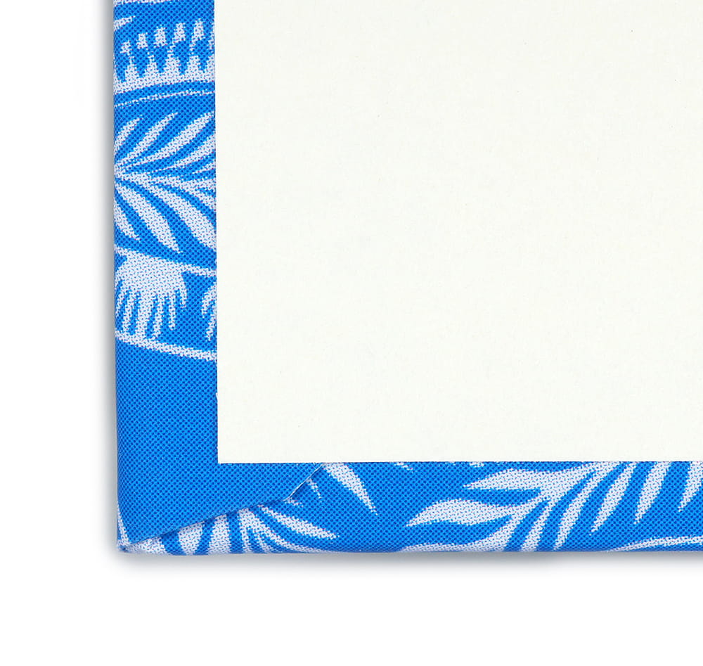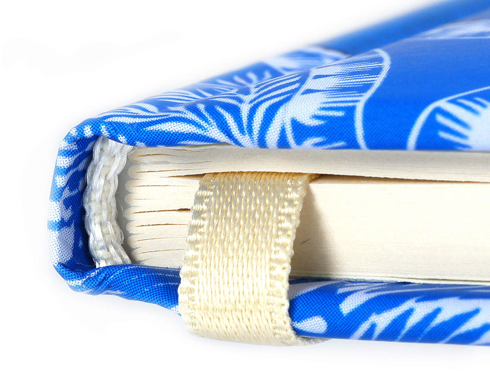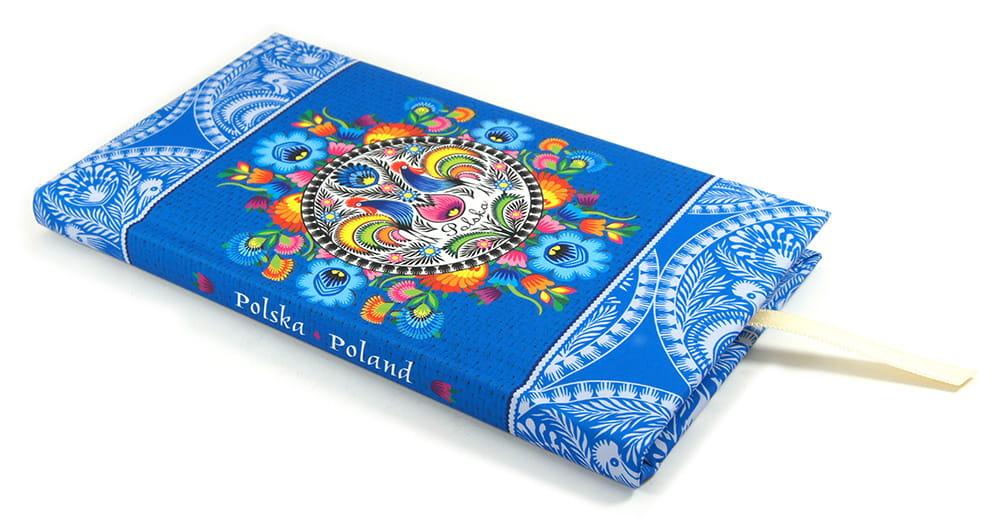 W środku kremowy papier, drukowany w linie o kolorze szarym, wstążkowa zakładka.