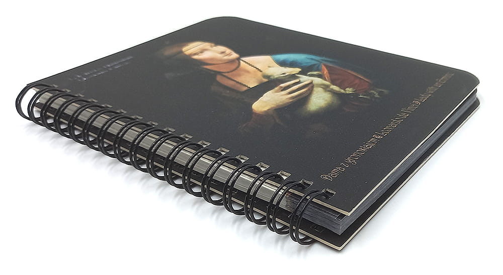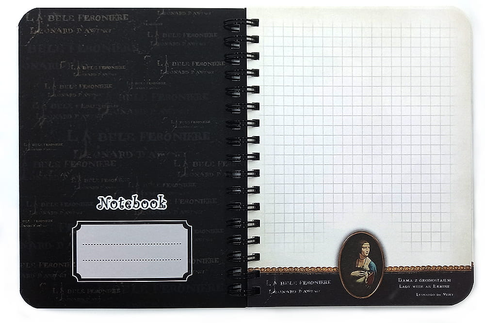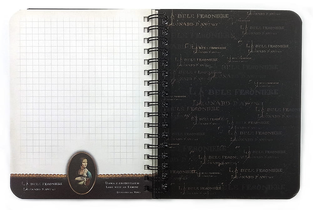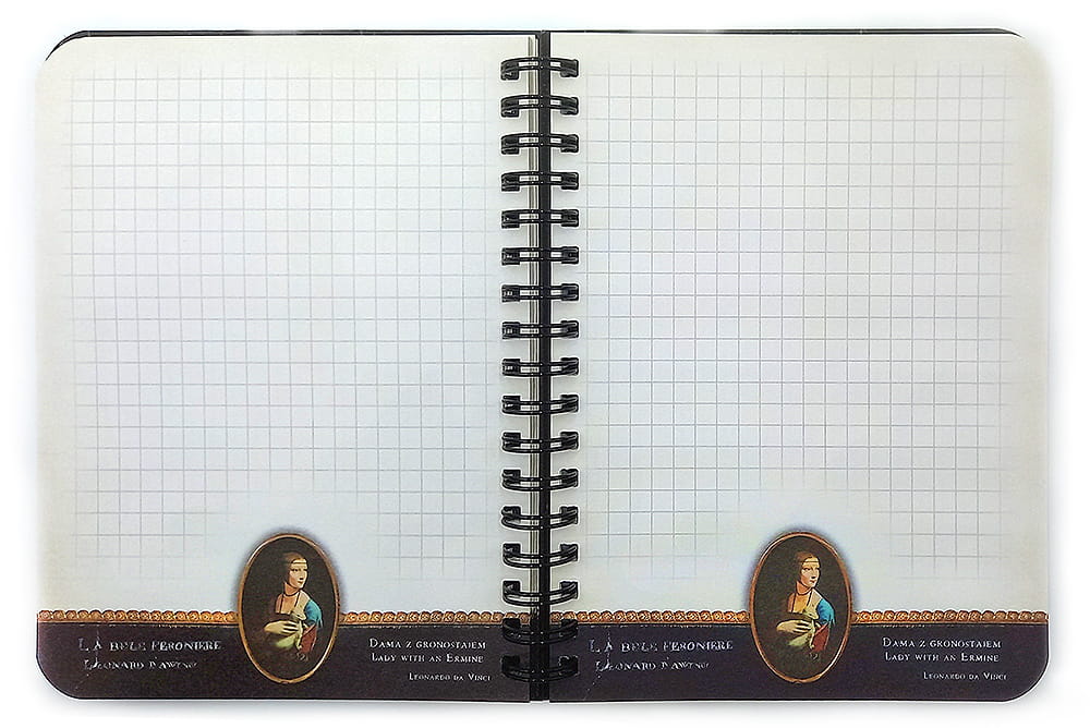 mocną okładką z kartonu pokrytą folią soft - aksamitną w dotyku. Kartki w kratkę z motywem graficznym nawiązującym do okładki.