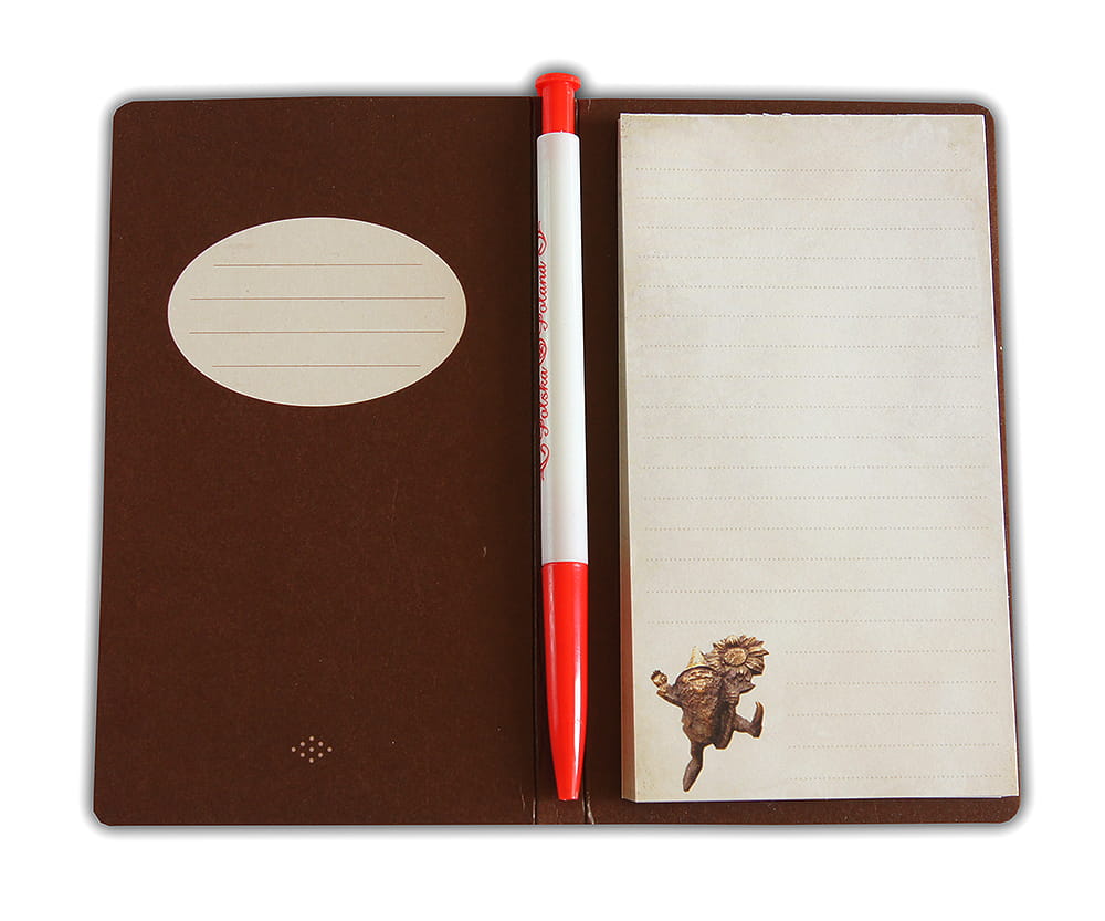 Okładka aksamitna w dotyku, kartki w bloczku z nadrukiem o wzorze dopasowanym do okładki.
