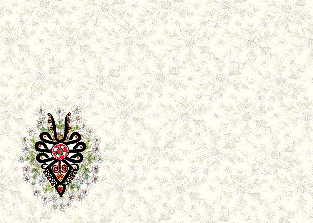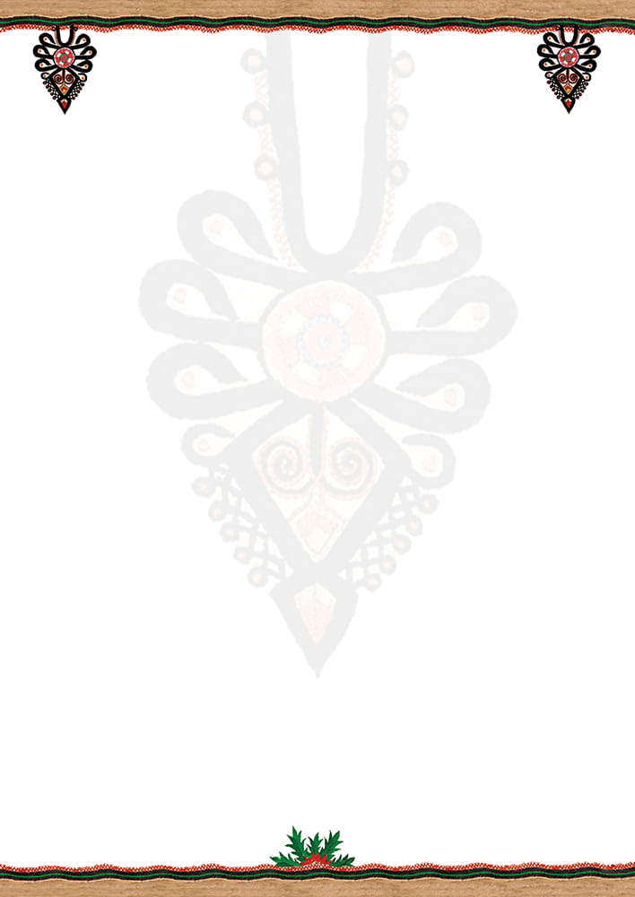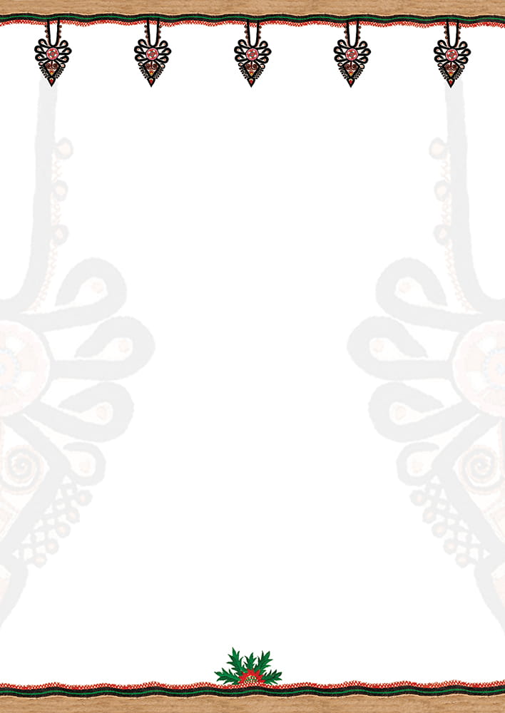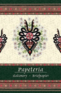 Zestaw złożony z 8 kopert formatu B6 i 8 kartek papieru listowego formatu B5. Zarówno na kopertach jak i na kartkach ozdobny folkowy nadruk. Papeteria zapakowana w estetyczną kartonową teczkę. Wyprodukowana w Polsce.