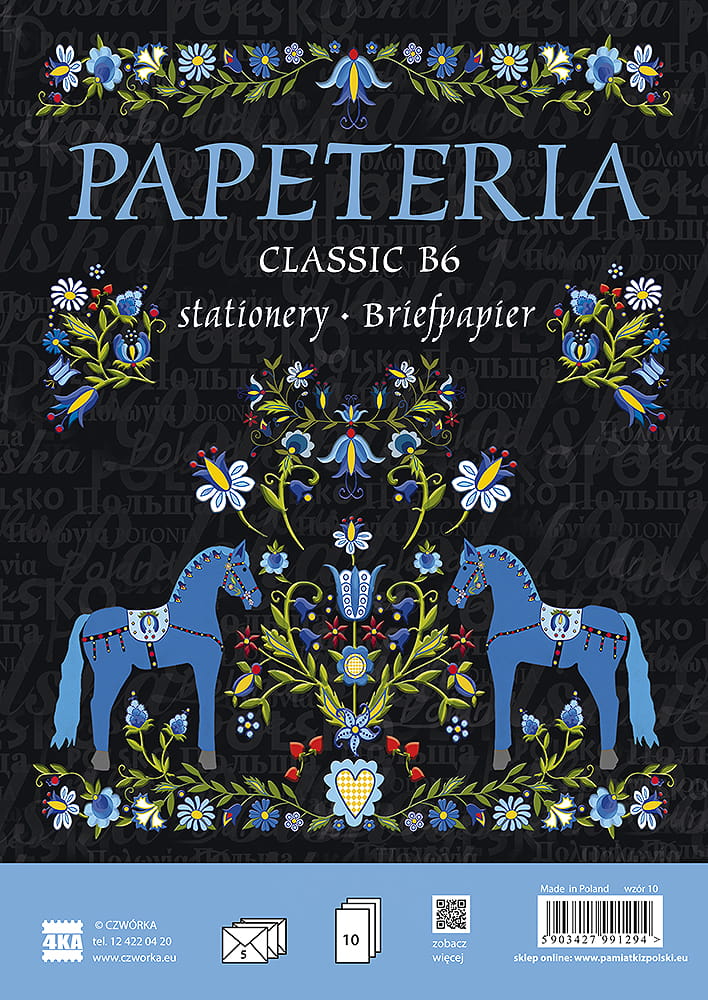 Zestaw złożony z 5 kopert formatu B6 i 10 kartek papieru listowego formatu B5. Zarówno na kopertach jak i na kartkach ozdobny nadruk nawiązujący do motywu umieszczonego na okładce. Papeteria zapakowana w woreczek PCV. Wyprodukowana w Polsce.