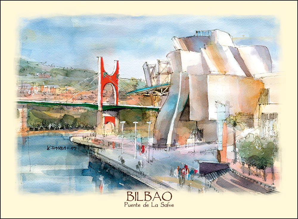 Przedstawia artystyczny obraz najciekawszych widoków i zakątków Bilbao,