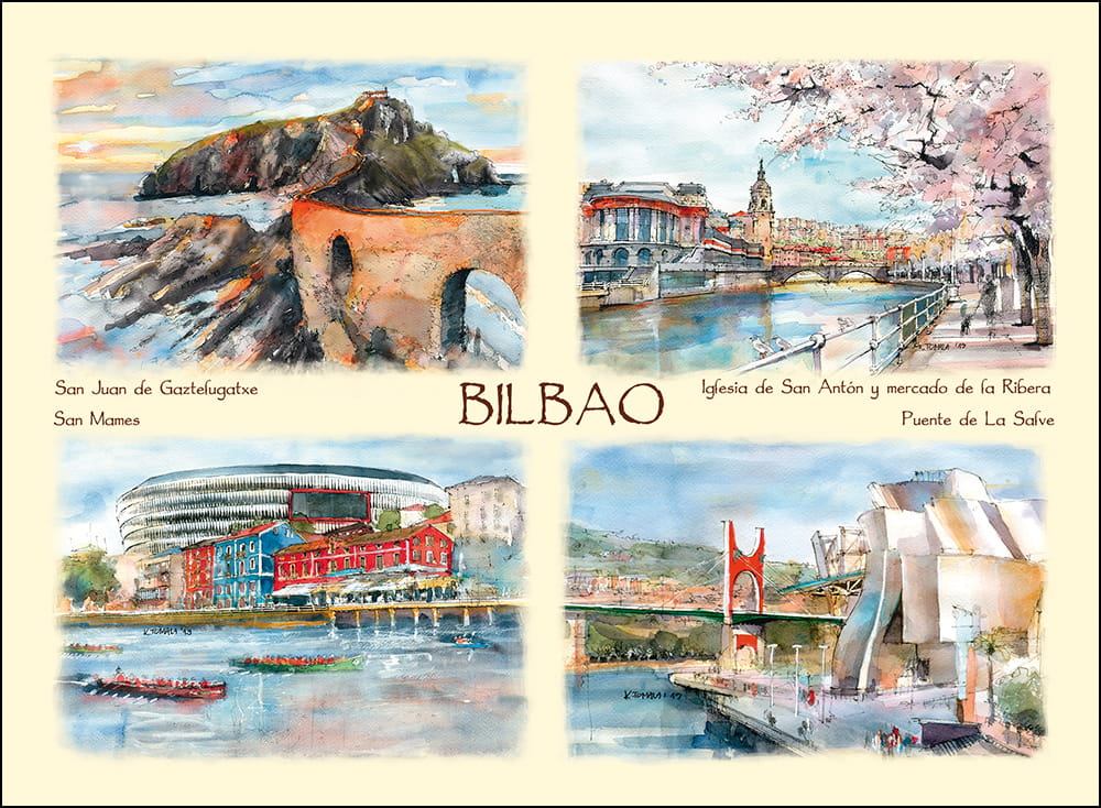 Przedstawia artystyczny obraz najciekawszych widoków i zakątków Bilbao,