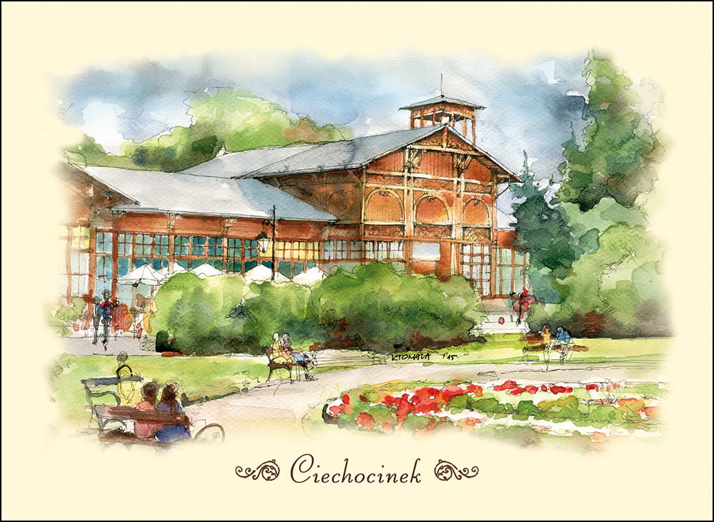 Przedstawia artystyczny obraz najciekawszych widoków i zakątków Ciechocinka,