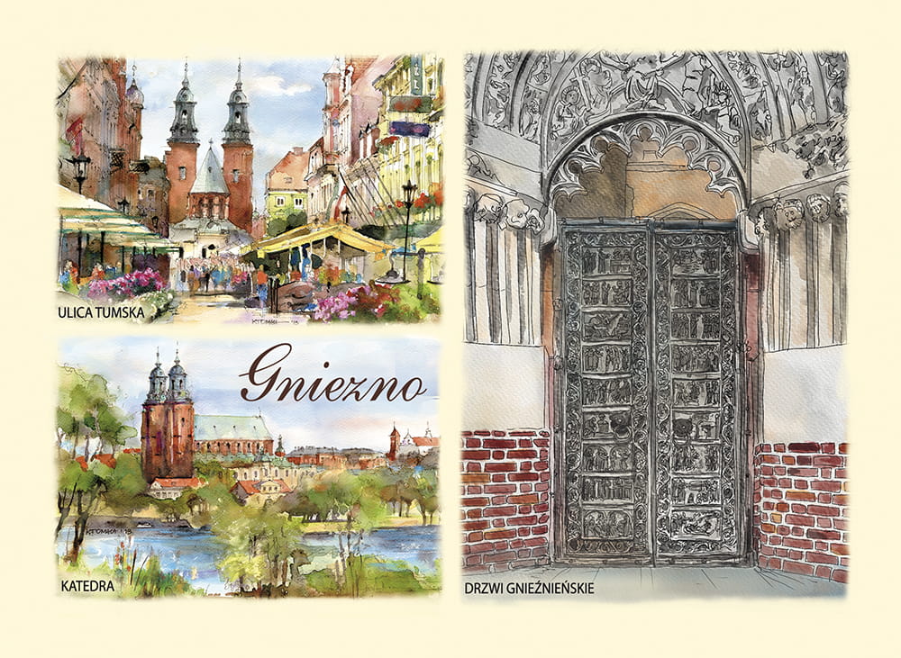 Przedstawia artystyczny obraz najciekawszych widoków i zakątków Gniezna,