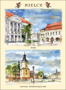 Przedstawia artystyczny obraz najciekawszych widoków i zakątków Kielc,