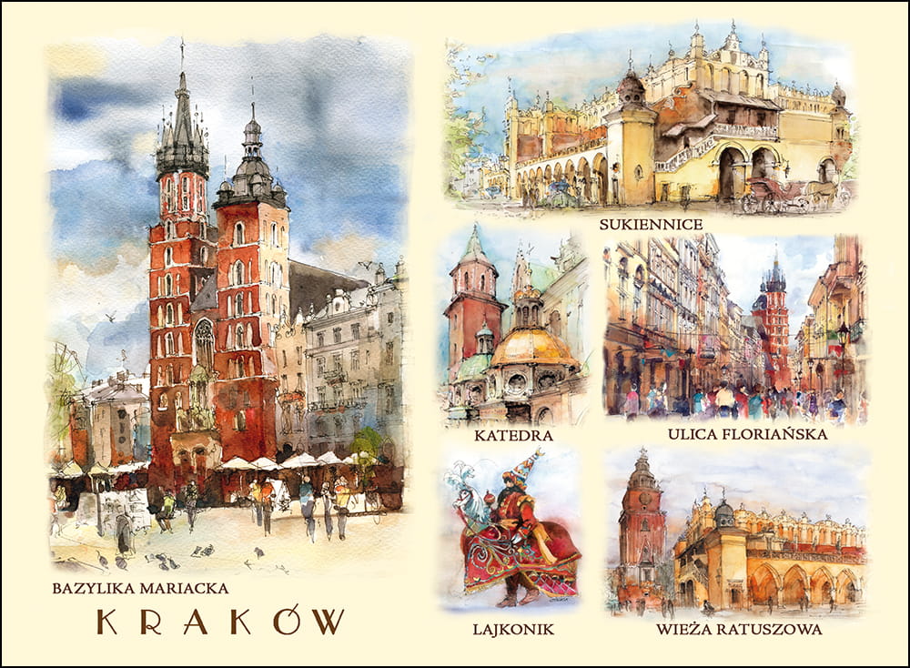 Przedstawia artystyczny obraz najciekawszych widoków i zakątków miasta Krakowa,