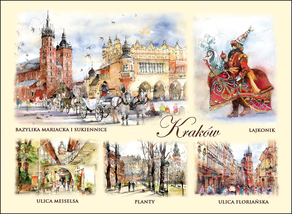 Przedstawia artystyczny obraz najciekawszych widoków i zakątków miasta Krakowa,