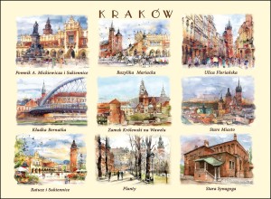 Przedstawia artystyczny obraz najciekawszych widoków i zakątków miasta Krakowa,