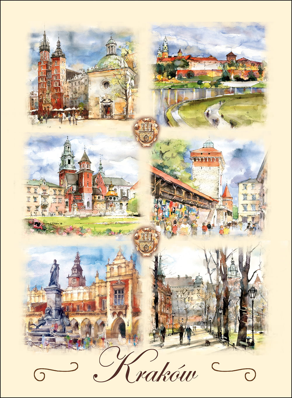 Przedstawia artystyczny obraz najciekawszych widoków i zakątków miasta Krakowa,