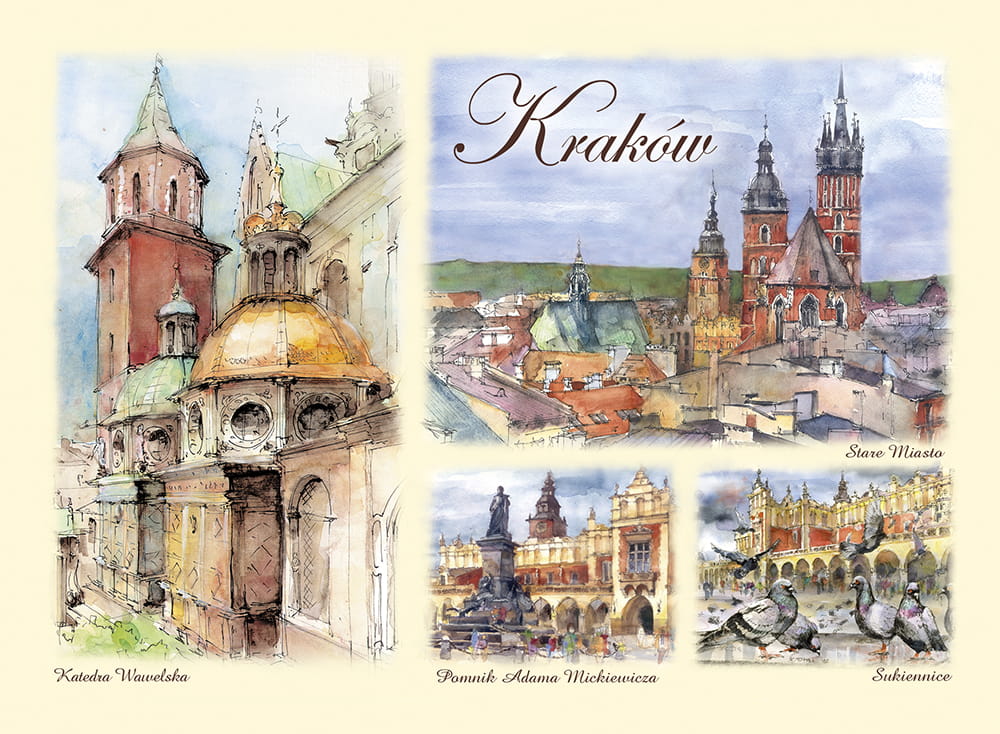 Przedstawia artystyczny obraz najciekawszych widoków i zakątków miasta Krakowa,