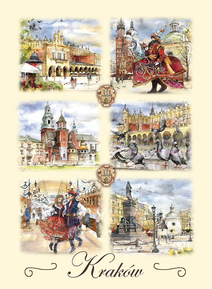 Przedstawia artystyczny obraz najciekawszych widoków i zakątków miasta Krakowa,