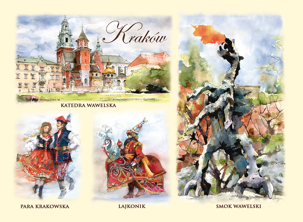 Przedstawia artystyczny obraz najciekawszych widoków i zakątków miasta Krakowa,