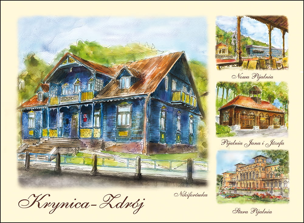 Przedstawia artystyczny obraz najciekawszych widoków i zakątków Krynicy Zdrój,