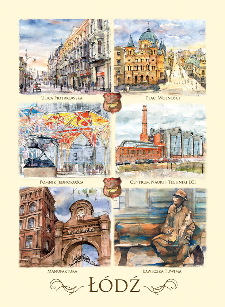 Przedstawia artystyczny obraz najciekawszych widoków i zakątków Łodzi,