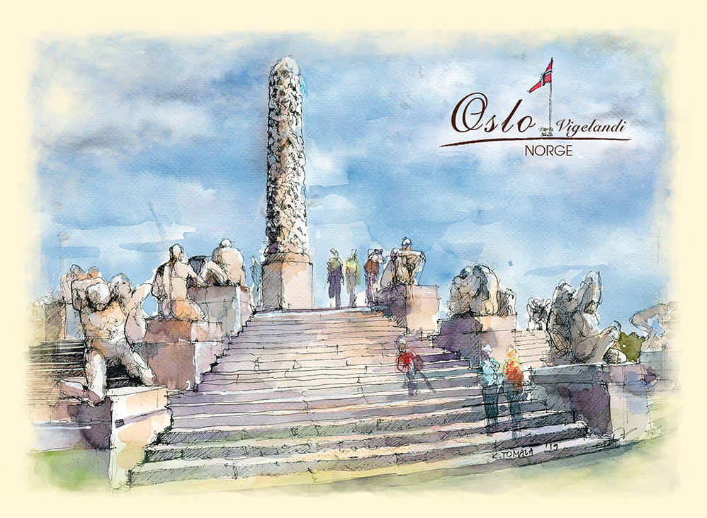 Przedstawia artystyczny obraz najciekawszych widoków i zakątków Oslo,